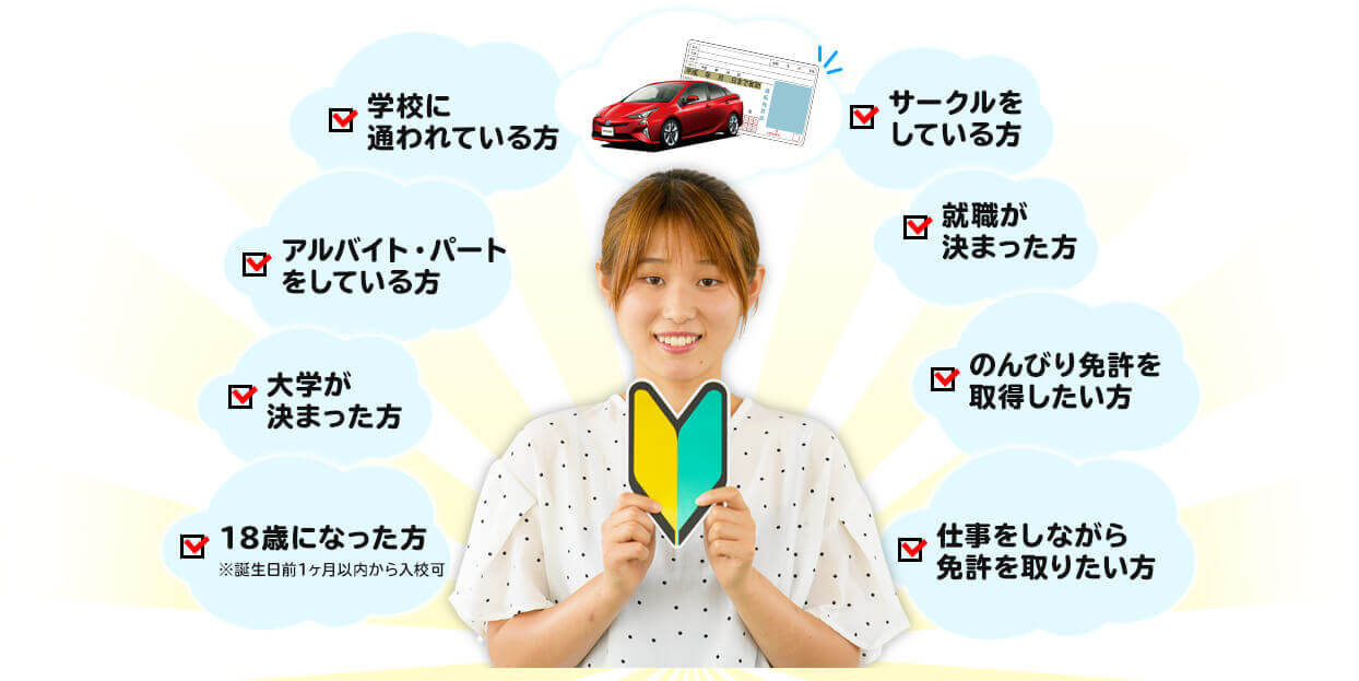 お仕事・学業・育児など、忙しく時間がないから免許は無理…と諦めていた方。当校は土日祝日はもちろん、充実のカリキュラムで忙しい人の味方です!休日を有効活用しましょう。