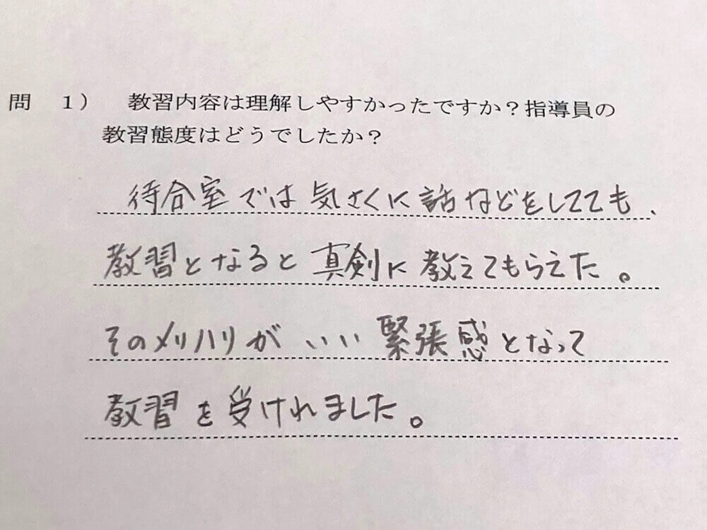 入所から卒業まで安心して通えます。ベテラン指導員揃いの当校が掲げるのは、「親切で丁寧な教習」。お客様が楽しく学べることが上達への近道と考え、全力でサポートさせていただきます。